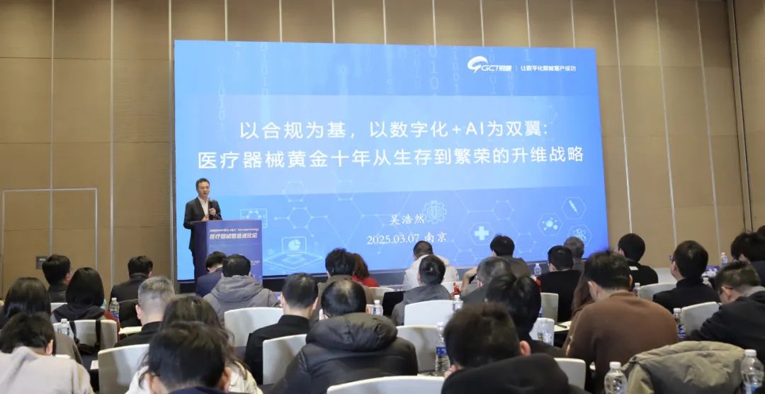 此外,冠骋信息分享了 《AI 引领变革:医疗器械智能制造创新分享》以及《科技引领,制造革新:医疗器械数字化工厂最佳实践与建设路径》主题报告。前者展示了冠骋信息在AI技术与医疗器械智能制造融合方面的最新成果。随着 AI 技术的飞速发展,AI 与数字化转型正加速融合,正全方位赋能医疗器械制造的各个环节。后者则深入剖析了医疗器械企业数字化工厂建设的核心路径,基于工信部智能制造能力成熟度模型的“流程化、数字化、网络化、智能化、产业链协同”五级进阶策略提出医疗器械行业的转型重点和方法,通过聚焦数字化精益制造、精益运营与合规保障三大目标来打造合规的医疗器械数字化工厂。