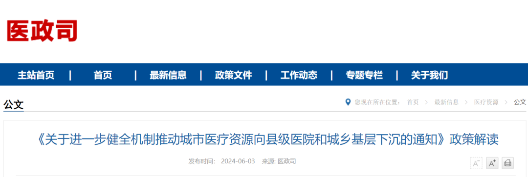 近期,国家卫生健康委会同国家中医药局、国家疾控局,联合印发了《关于进一步健全机制推动城市医疗资源向县级医院和城乡基层下沉的通知》,要求通过深化城市医院支援县级医院工作、组织城市医院支援社区卫生服务中心等途径,努力推动优质医疗资源“沉下去”。