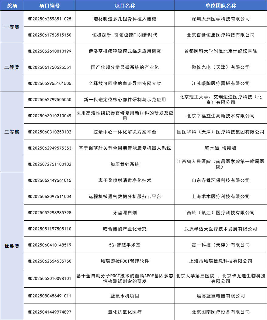 本场京津冀医疗器械产业化专场赛共评选出了评选出了一等奖2名、二等奖3名、三等奖5名、优胜奖9名。