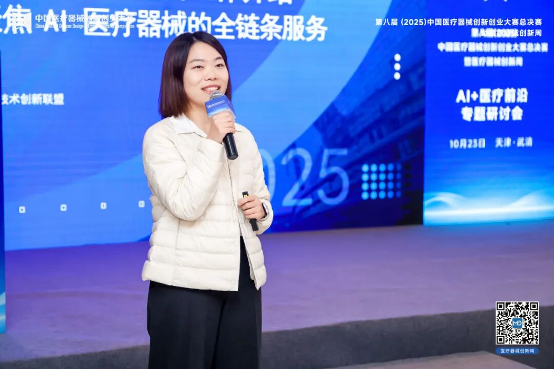 国家医疗器械产业技术创新联盟、医疗器械创新网网运营总监戴婷,分享了AI医疗器械现状、挑战及未来趋势。她介绍,平台依托“一网+一赛”资源,联合近400家创服机构,为AI医疗企业提供从研发立项、临床验证、注册申报到融资招商的全链条服务,已累计服务超4000个创新项目。